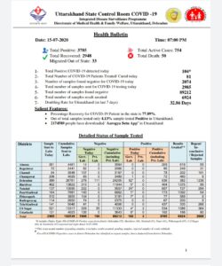 कोरोना वायरस संक्रमण को लेकर उत्तराखंड में आज भी राहत देने वाली खबर नही है स्वास्थ्य विभाग से जारी हेल्थ बुलेटिन के अनुसार उत्तराखंड राज्य में 104 लोग कोरोना से संक्रमित मिले हैं इसके बाद राज्य में कोरोना 3785 संक्रमित लोगों के कुल संख्या हो गई है जिसमें अभी तक 2948 कोरोना से संक्रमित लोग उत्तराखंड राज्य में ठीक हो चुके हैं ।।