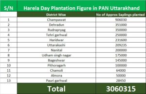 प्रकृति और पर्यावरण के पावन पर्व हरेला के अवसर पर प्रदेश में 30 लाख से अधिक पौधे लगाए गए। सभी 13 जिलों में रिकार्ड 3060315 पौधे लगाए गए। मुख्यमंत्री श्री त्रिवेन्द्र सिंह रावत ने प्रदेशवासियों से हरेला पर कम से कम एक पौधा जरूर लगाने का आह्वान किया था। प्रदेशभर में वन, उद्यान, प्रशासन के साथ ही आमजन ने भी इसमें भागीदारी की। खास बात यह भी रही कि कोरोना के कारण विगत वर्षों की भांति वृक्षारोपण के बङे आयोजन नहीं किये गये फिर भी 30 लाख से अधिक पौधे लगाए गए। मुख्यमंत्री ने इस पर प्रदेशवासियों को बधाई देते हुए कहा कि अब इन लगाए गए पौधों की सुरक्षा सुनिश्चित करनी है।