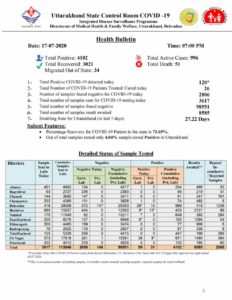 कोरोना वायरस संक्रमण को लेकर उत्तराखंड में आज भी राहत देने वाली खबर नही है स्वास्थ्य विभाग से जारी हेल्थ बुलेटिन के अनुसार उत्तराखंड राज्य में 120 लोग कोरोना से संक्रमित मिले हैं इसके बाद राज्य में कोरोना 4102 संक्रमित लोगों के कुल संख्या हो गई है जिसमें अभी तक 3021 कोरोना से संक्रमित लोग उत्तराखंड राज्य में ठीक हो चुके हैं ।।