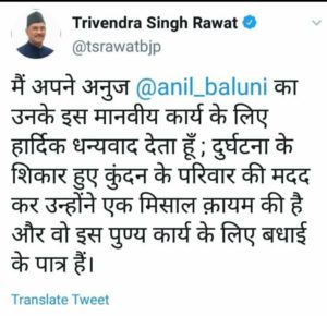 देहरादून:- उत्तराखंड के मुख्यमंत्री त्रिवेंद्र सिंह रावत ने उत्तराखंड से राज्यसभा सांसद अनिल बलूनी को ट्वीट कर धन्यवाद दिया।।