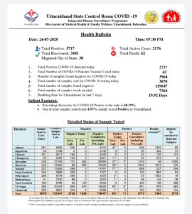 उत्तराखंड स्वास्थ्य विभाग द्वारा कोविड-19 समाचार जारी टोटल संख्या 5717 आज उत्तराखंड में आज भी चौका देने वाला आंकड़ा 272 कोरोनावायरस पॉजिटिव मरीज मिले- सबसे ज्यादा उधमसिंहनगर जनपद में 90