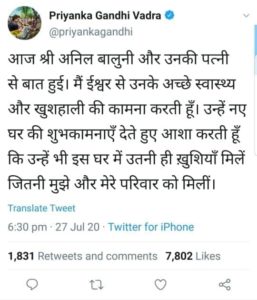 देहरादून:- कांग्रेस की राष्ट्रीय महासचिव प्रियंका गांधी ने भाजपा राज्यसभा सांसद अनिल बलुनी को पत्र लिखकर अपने घर चाय के लिए सपरिवार आमंत्रित किया था जिसके बाद प्रियंका गांधी ने ट्वीट कर बताया कि आज श्री अनिल बलूनी और उनकी पत्नी से बात हुई मैं ईश्वर से उनके अच्छे स्वास्थ्य और खुशहाली की कामना करती हूं नए घर की शुभकामनाएं देते हुए आशा करती हूं कि उन्हें भी इस घर में उतनी ही खुशी मिले जितनी मुझे और मेरे परिवार को मिली ।।