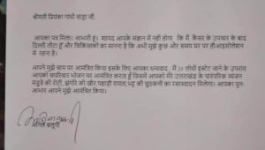 अनिल बलूनी ने प्रियंका गांधी वाड्रा को पत्र दिखा उन्होंने लिखा कि आपका पत्र मिला जिसका आभारी हूं शायद आपके संज्ञान में नहीं होगा कि मैं कैंसर के उपचार के बाद दिल्ली लौटा हूं और चिकित्सकों का मानना है कि अभी मुझे कुछ और समय घर पर ही आइसोलेशन में रहना है आप ने मुझे चाय पर आमंत्रित किया इसके लिए आपका धन्यवाद मैं 35 लोधी एस्टेट जाने के उपरांत आपको सपरिवार भोजन पर आमंत्रित करता हूं जिसमें आपको मेरे उत्तराखंड के पारंपरिक व्यंजन मडुवे की रोटी झंगोरा की खीर पहाड़ी रायता भट्ट की चुठकनी का रसास्वादन मिलेगा आपका पूरा आभार आपने मुझे आमंत्रित किया ।