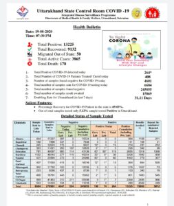 उत्तराखंड स्वास्थ्य विभाग द्वारा जारी कोविड-19 समाचार आज उत्तराखंड में 264 कोरोनावायरस के मरीज पाए गए सबसे अधिक देहरादून में 118 मृतकों की संख्या 178 पहुंची