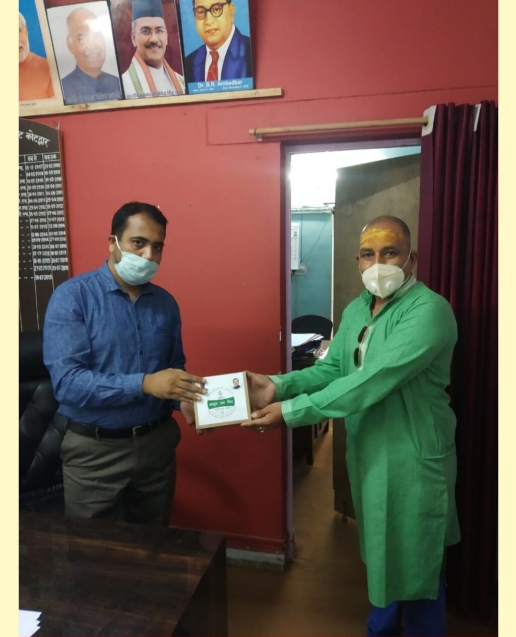 कोटद्वार : राजकीय आयुर्वेद चिकित्सालय प्रभारी डॉ. जयदीप बिष्ट द्वारा रक्षा किट वितरित की गई। प्रभारी चिकित्सा अधिकारी डॉ. जयदीप सिंह बिष्ट एवं आयुर्वेद चिकित्सालय के कर्मचारी राजेंद्र सिंह रावत, सतीश कोहली उत्तराखंड सरकार (आयुष विभाग) द्वारा आयुष रक्षक किट का वितरण किया गया जयदीप डॉ. बिष्ट द्वारा उप जिलाधिकारी कोटद्वार, हेमलता नेगी महापौर नगर निगम कोटद्वार, सहायक नगर आयुक्त, कोतवाली कोटद्वार में वरिष्ठ उप निरीक्षक प्रदीप नेगी, उप निरीक्षक भावना भट्ट आदि लोगों को रक्षा किट दी गयी।डॉ. जयदीप बिष्ट द्वारा बताया गया कि ये आयुर्वेदिक रक्षा किट हमारे शरीर की प्रतिरोधक क्षमता को बढ़ाता है इसका सेवन शुबह शाम चाय की तरह करने पर ये बहुत सी बीमारियों को दूर करता है इसलिए वर्तमान समय मे कोरोना महामारी को देखते हुए इसका नियमित सेवन करना चाहिए।इस अवसर पर सभी संबंधित विभाग के अधिकारी मौजूद रहे डॉ जयदीप सिंह बिष्ट द्वारा सभी कॉविड वरियर्स का आभार व्यक्त किया गया व कोविड-19 मे उन सभी लोगो का आभार व्यक्त किया जिन्होंने प्रत्यक्ष अप्रत्यक्ष रूप से इस महामारी से निपटने में अपना महत्वपूर्ण योगदान दे रहे है उनके द्वारा महामारी से निपटने हेतु बचाओ संबंधित मास्क,सेनेटाइजर,असामाजिक दूरी आदि के बारे में विस्तार पूर्वक जानकारी दी गई।।।