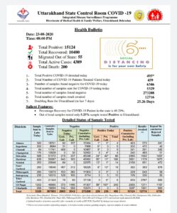देहरादून :- उत्तराखंड स्वास्थ विभाग द्वारा जारी कोविड-19 समाचार टोटल संख्या 15124 आज उत्तराखंड में कोरोनावायरस के 495 मरीज पाए गए इनमें उधम सिंह नगर में 249 हरिद्वार में 106 देहरादून में 66 मृतकों की संख्या 200 पहुंची है About The Author Himalaya sandesh See author's posts Post Views: 552 Continue Reading Previous गंगनहर पुलिस व ड्रग विभाग की टीम ने सालियर में नकली दवाई बनाने की फैक्ट्री का किया भंडाफोड़Next 3.10 लाख करोड़ रुपये की लागत से 22 ग्रीन एक्सप्रेस-वे का निर्माण हो रहा है : नितिन गडकरी Leave a Reply Cancel replyYour email address will not be published. Required fields are marked *Comment * Name * Email * Website Save my name, email, and website in this browser for the next time I comment. More Stories उत्तराखंड एक्सक्लूसिव खास खबर देहरादून राज्य उत्तराखंड: अप्रैल और मई महीने में गर्मी सताएगी, मैदान से लेकर पहाड़ तक चढ़ेगा पारा April 1, 2025 Himalaya sandesh उत्तराखंड एक्सक्लूसिव खास खबर देहरादून राज्य मौसम अपडेट : उत्तराखंड में मौसम 17 मार्च तक रहेगा खराब March 14, 2025 Himalaya sandesh उत्तराखंड एक्सक्लूसिव खास खबर देहरादून राज्य रुद्रप्रयाग में बड़ा हादसा, हादसे में तीन युवकों की मौके पर मौत March 8, 2025 Himalaya sandesh