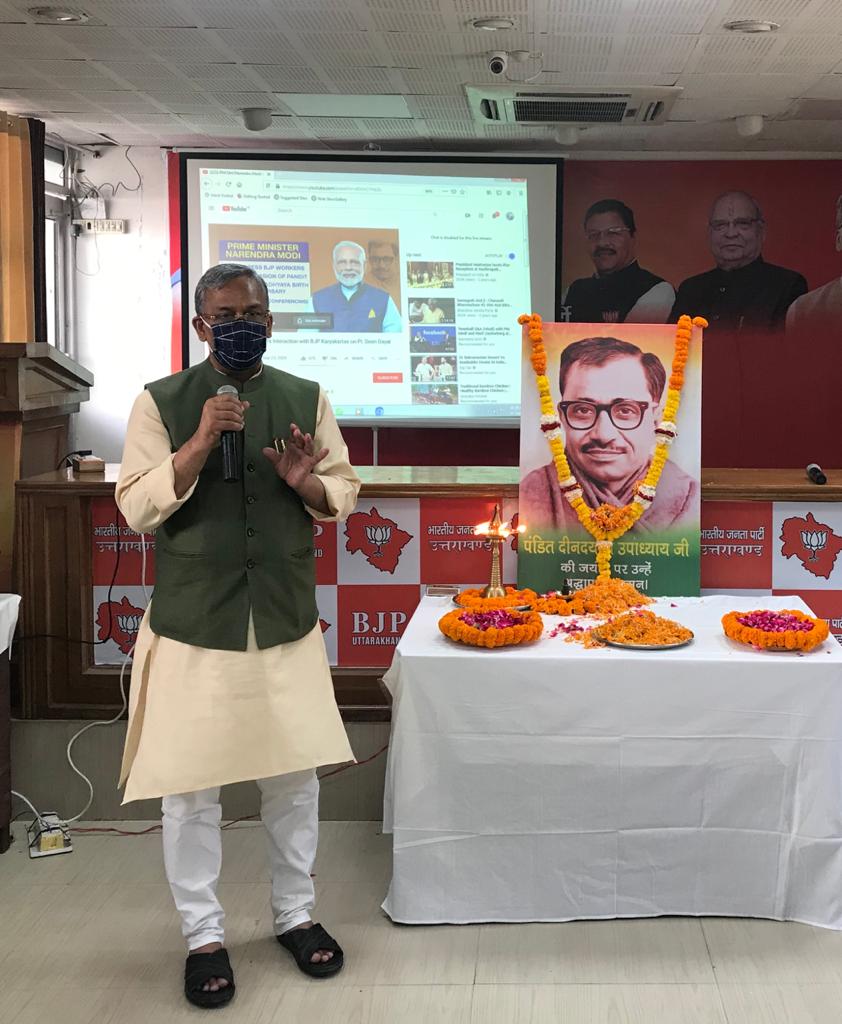 इस अवसर पर मुख्यमंत्री श्री त्रिवेंद्र सिंह रावत ने कहा कि पंडित दीनदयाल उपाध्याय दूरदृष्टि सोच के महान विचारक थे उन्होंने समय कह दिया था कि जिस दिन समाज के अंतिम छोर पर बैठे सबसे निचले स्तर का व्यक्ति देश की सर्वोच्च कुर्सी पर बैठेगा वही भारत के लोकतंत्र की असली सफलता होगी आज वही विचार प्रधानमंत्री श्री नरेन्द्र मोदी के रूप में देश को मिला है।उन्होंने कहा कि किसी ने सोचा भी नही होगा मथुरा के नागल गाँव मे एक बहुत ही निर्धन परिवार में जन्म लेने वाला अनाथ बालक के जीवन दर्शन से भारतीय राजनीति दर्शन का सूत्रपात होगा। इस अवसर पर श्री त्रिवेंद्र रावत ने कृषि विधेयक पर कांग्रेस व अन्य दलों के विरोध को जनता को सिर्फ गुमराहित करना मात्र बताते हुए कहा कि प्रधानमंत्री नरेंद्र मोदी ने ही सबसे पहले किसानों 50 पैसे प्रति यूनिट बिजली देने व लगातार 12 घंटे बिजली देने का काम किया है जो आज कृषि विधेयक का विरोध कर रहे है उनको जनता को जवाब देना चाहिए कि उन्होंने किसानों के हितों के लिए विगत 70 वर्षों में क्या क्या कार्य किये हैं।