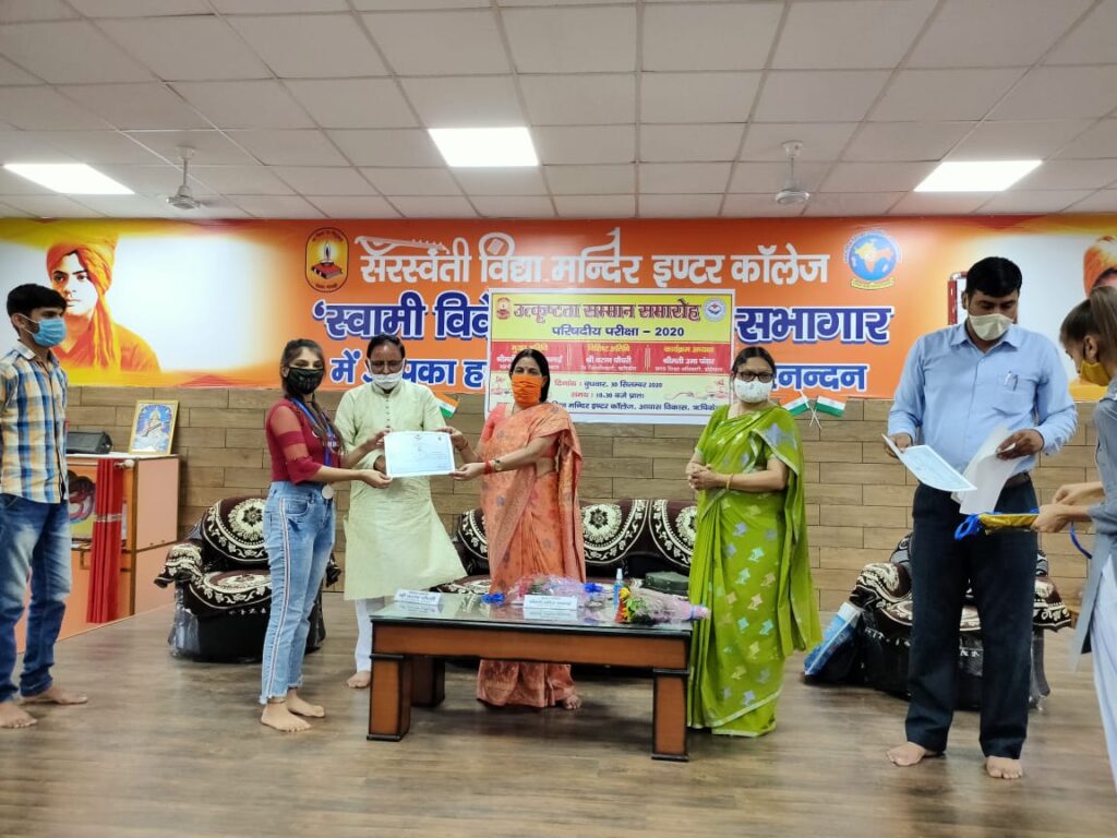 सामाजिक दूरी को ध्यान में रखकर कार्यक्रम का शुभारंभ मुख्य अतिथि महापौर अनिता ममगाईं, उमा पँवार कार्यक्रम अध्यक्षा खण्ड शिक्षा अधिकारी, एवं सरस्वती विद्या मंदिर इंटर कॉलेजआवास विकास के प्रधानाचार्य राजेंद्र प्रसाद पाण्डेय ने संयुक्त रुप से दीप प्रवज्जलित कर किया। इस अवसर पर अपने संबोधन में नगर निगम महापौर ने कहा कि शिक्षा के बगैर किसी भी राष्ट्र को मजबूत नहीं बनाया जा सकता। उन्होंने मेधावियों को शुभकामनाएं देते हुए कहा कि आप सब ने अपने कठिन परिश्रम से साबित कर दिखाया है कि सफलता की कोई कुंजी नही होती और न ही इसका कोई शार्टकट होता है। उन्होंने कहां की छात्र जीवन में संस्कारित व्यवहार करने वाले बच्चे ही सर्वोच्च पदों पर काबिज हो पाते हैं ।अपने गुरुओं एवं अभिभावकों का बच्चों को सदैव सम्मान करना चाहिए। महापौर ममगई ने कहा कि मौजूदा दौर प्रतिस्पर्धा का दौर है , शिक्षा में प्रतिस्पर्धा और बेहतर करने के लिए प्रेरित करती है। महापौर ने कार्यक्रम में मोजूद शिक्षाविदों से संस्कारित शिक्षा पर जोर देने का आह्वान भी किया।समारोह के दौरान