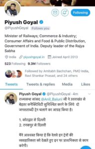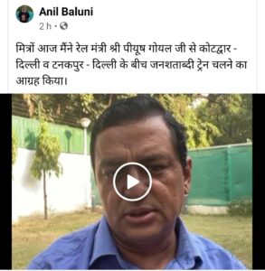 उत्तराखंड से राज्यसभा सदस्य एवं भाजपा के राष्ट्रीय मुख्य प्रवक्ता व मीडिया प्रमुख अनिल बलूनी ने सोशल मीडिया में जारी वीडियो के माध्यम से बताया कि उन्होंने रेल मंत्री पीयूष गोयल से उत्तराखंड के लिए दो जन शताब्दी ट्रेनों के संचालन का आग्रह किया है।