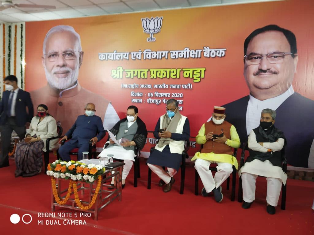 प्रदेश के कार्यालयों एवं विभागों की समीक्षा बैठक का प्रारम्भ श्री नड्डा ने दीप प्रज्वलन कर किया ।राष्ट्र अध्यक्ष श्री जगत प्रसाद नड्डा ने बैठक में अपेक्षित पदाधिकारियों से परिचय प्राप्त किया और विभिन्न 30 विभागों के बारे में जानकारी प्राप्त की ।उन्होंने कार्यकर्ताओं को कार्यालयों व विभागों में सक्रियता से अपनी भागीदारी निभाने को निर्देशित किया। श्री नड्डा ने विभागों के सभी कार्यकर्ताओं का पूरे उत्साह के साथ कार्य करने का आह्वान किया।उन्होंने कहा किसंगठन को चलाने के लिए एकरूपता की आवश्यकता है ।सभी को अपनी चिंता को छोड़कर संगठन की चिंता करनी चाहिए ।आधुनिक जिला कार्यालय का निर्माण मोदी जी का सपना है क्योंकि कार्यालय ही एक ऐसी जगह है जहां पर कार्यकर्ताओं को अच्छा वातावरण मिलने पर एक अच्छे कार्यकर्ता का निर्माण होता है। हमें कार्यालयों को आधुनिक बनाना होगा ।जिससे लाखों कार्यकर्ता गण इसका लाभ ले सके श्री नड्डा जी ने कार्यकर्ता गणों को अपने कार्य का ब्लू प्रिंट तैयार कर उसे संगठन हित में फलीभूत करने के लिए निर्देशित किया ।यह सभी विभाग संगठन के विशेष अंग है ,इनसे निश्चित रूप से कार्यकर्ताओ को लाभ होगा ।कार्यकर्ता गणों ने भी राष्ट्रीय अद्यक्ष जी से अपने विभागों से संबंधित जानकारी ली और सुझाव भी रखे।