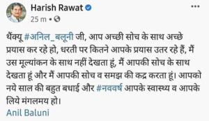 फेस बुक के जरिये उन्होंने बलूनी की सोच के प्रति खुशी जाहिर करते हुए हार्दिक बधाई भी दी है। रावत ने लिखा है कि आपके प्रयास सफल हो रहे है
