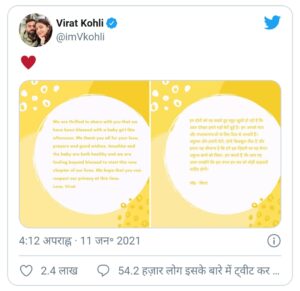 इसी के साथ विराट ने अपने ट्वीट में लोगों से एक अपील भी की है. उन्होंने अनुष्का और अपनी बेटी की सेहत के बारे में बताने के बाद लिखा- हमें उम्मीद है कि आप इस वक्त हमारे निजी पलों का सम्मान करेंगे.