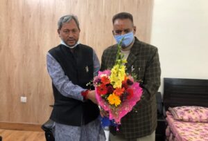 सैनिक कल्याण, औद्योगिक विकास, एमएसएमई एवं खादी ग्रामोद्योग मंत्री गणेश जोशी ने देहरादून के बीजापुर गेस्ट हाउस में मुख्यमंत्री तीरथ सिंह रावत से मुलकात की। उन्होनें मुख्यमंत्री को पुष्पगुच्छ भेंट कर सैनिक कल्याण, औद्योगिक विकास, लघु, सूक्ष्म एवं मध्यम उद्यम तथा खादी ग्रामोद्योग विभाग आंवटित किये जाने पर धन्यवाद किया।