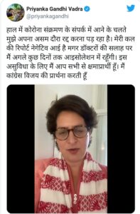 कांग्रेस महासचिव प्रियंका गांधी ने असम में अपना चुनाव प्रचार रद्द कर दिया है और अगले कुछ दिनों तक वो होम क्वारंटीन रहेंगी। बताया जा रहा है कि प्रियंका के पति रॉबर्ट वाड्रा कोरोना पॉजिटिव हो गए हैं जिसके बाद प्रियंका ने कुछ दिन होम क्वॉरंटीन रहने का फैसला लिया है।