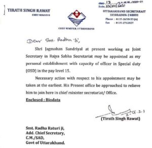 मुख्यमंत्री तीरथ सिंह रावत के ओएसडी के तौर पर राज्यसभा के संयुक्त सचिव जगमोहन सुंदरियाल को नियुक्ति दे दी गयी है। जगमोहन सुंदरियाल को मुख्यमंत्री का ऑफिसर इन स्पेशल ड्यूटी के पद पर तैनात किया गया. About The Author Himalaya sandesh See author's posts Post Views: 640 Continue Reading Previous पर्यटन मंत्री पहुंचे बंगाल, करेंगे प्रचार।Next मौसम विभाग ने किया पूर्वानुमान। Leave a Reply Cancel replyYour email address will not be published. Required fields are marked *Comment * Name * Email * Website Save my name, email, and website in this browser for the next time I comment. More Stories उत्तराखंड एक्सक्लूसिव खास खबर देहरादून राज्य उत्तराखंड: अप्रैल और मई महीने में गर्मी सताएगी, मैदान से लेकर पहाड़ तक चढ़ेगा पारा April 1, 2025 Himalaya sandesh उत्तराखंड एक्सक्लूसिव खास खबर देहरादून राज्य मौसम अपडेट : उत्तराखंड में मौसम 17 मार्च तक रहेगा खराब March 14, 2025 Himalaya sandesh उत्तराखंड एक्सक्लूसिव खास खबर देहरादून राज्य रुद्रप्रयाग में बड़ा हादसा, हादसे में तीन युवकों की मौके पर मौत March 8, 2025 Himalaya sandesh