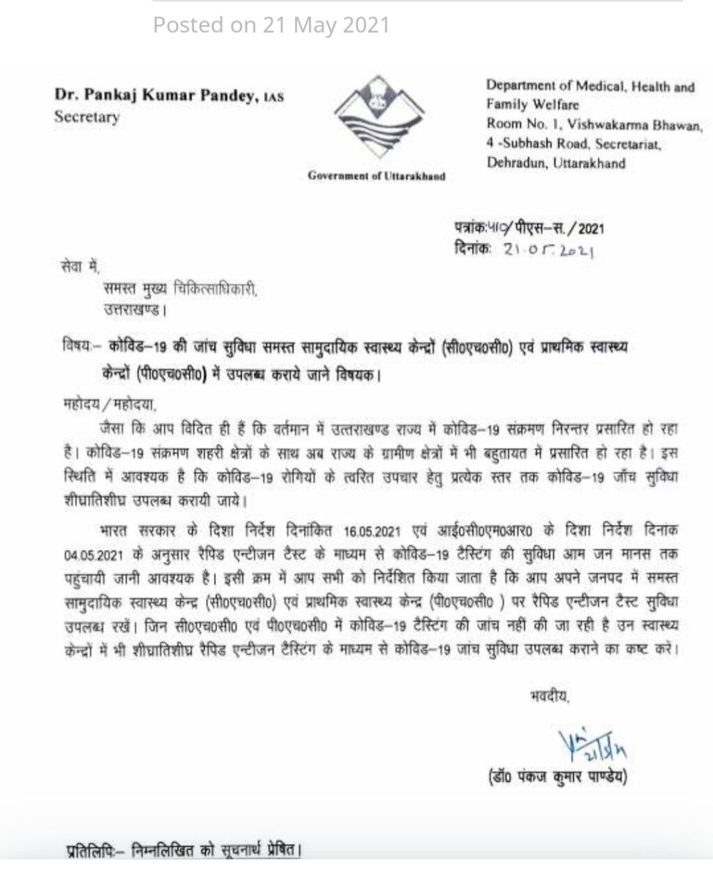 देहरादून– उत्तराखंड में अब सरकार ने ग्रामीण क्षेत्रों में  तेजी से फैल रहे कोरोना संक्रमण को देखते हुए अब बड़ा फ़ैसला किया है, राज्य के स्वास्थ्य सचिव पंकज कुमार पांडे ने सभी मुख्य चिकित्सा अधिकारियों को दिशा निर्देश देते हुए कहा है कि ग्रामीण क्षेत्रों में कोरोनावायरस संक्रमण की टेस्टिंग बढ़ाने के लिए सभी  सामुदायिक स्वास्थ्य केंद्र में रैपिड एंटीजन टेस्ट सुविधा उपलब्ध कराई जाए, एवं साथ ही यह भी निर्देशित कर  दिया गया है कि जिन सीएचसी व पीएचसी में कोविड-19 की जांच नहीं की जा रही है, उन स्वास्थ्य केंद्रों में भी जल्द से जल्द रैपिड टेस्टिंग के माध्यम से कोविड-19 जांच सुविधा उपलब्ध कराएं, जिससे समय पर ग्रामीणों की जांच हो सके, व ग्रामीणों को जांच करवाने के लिए बाहर न जाना पड़े सरकार के  इस  फैसले से जल्दी व शीघ्रता से कोरोनवायरस संक्रमण को फैलने से रोका जाने के बड़े कदम के रूप में देखा जा सकता है ।