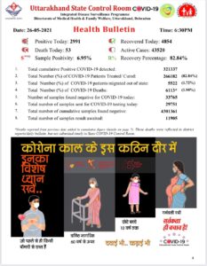 उत्तराखंड में आज कोरोनावायरस के 2991 पॉजिटिव मरीज पाए गए पिछले 24 घंटे में 53 लोगों की मृत्यु.