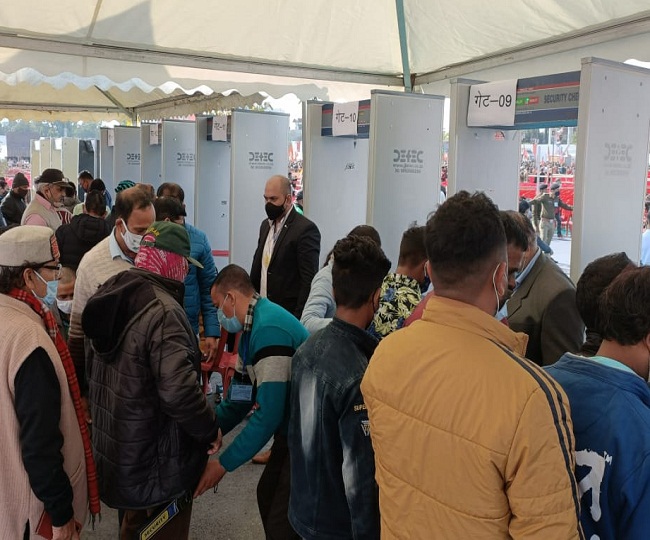 पीएम की रैली में सुरक्षा को लेकर हर गेट पर चेकिंग के लिए पुलिस से लेकर एलआइयू के कर्मचारी तैनात हैं। इस दौरान काला मास्क और काली जैकेट पहनकर पहुँच रहे लोगों को गेट पर ही रोक दिया जा रहा है। इस दौरान कुछ लोगों की बहस भी हुई। लेकिन पुलिस ने अंदर नहीं जाने दिया। जिसके बाद लोग जैकेट को गाड़ी या अन्य जगह रखकर दोबारा आए। साथ ही दूसरे रंग का मास्क भी खरीदना पड़ा। वहीं रैली में हिस्सा लेने आई दिव्यांग महिला ने काला जैकेट पहन रखा था। जिसके बाद उसे लौटने के लिए कहा गया। ऐसे में एक महिला पुलिसकर्मी ने उसकी मदद की।
