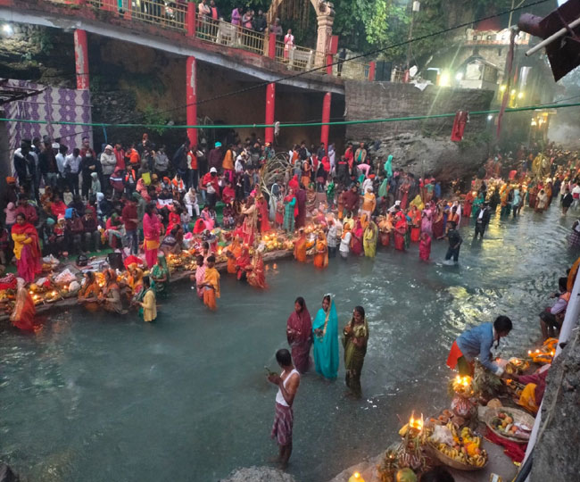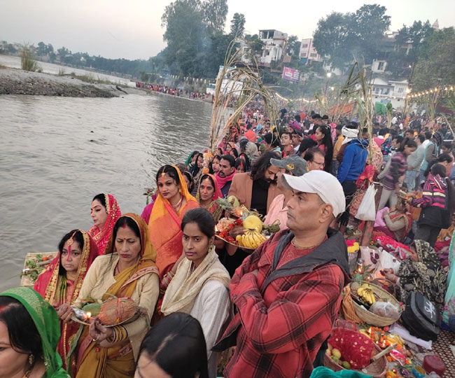 ऋषिकेश के त्रिवेणी घाट पर उगते हुए सूर्य को अर्घ्य देने के लिए पूर्वांचली समुदाय के लोगों की भीड़ जुटी। व्रती महिलाएं सोलह श्रृंगार कर घाट पर उगते हुए सूर्य की पूजा अर्चना कर रही हैं। तपोवन से लेकर हरिपुर कला तक गंगा घाट लोगों की भीड़ से गुलजार है।